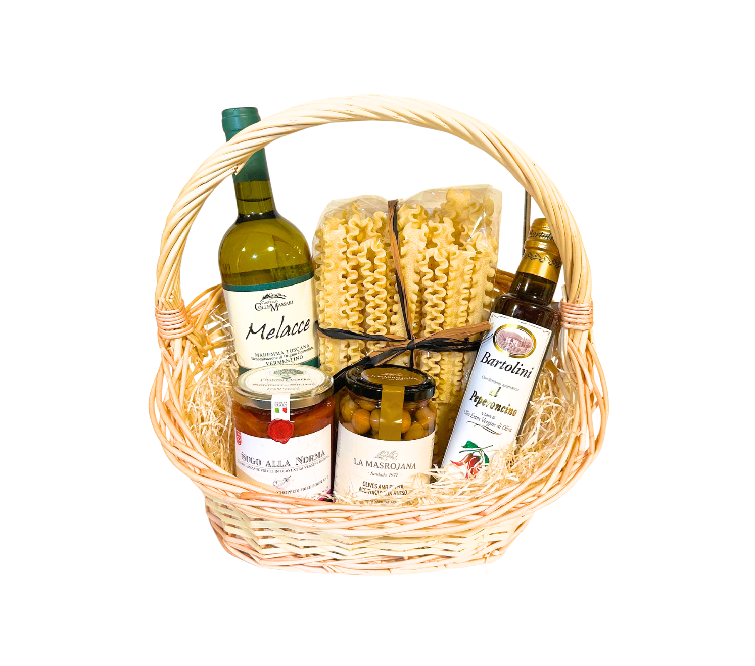 Inhalt: Castello ColleMassari 2023, Melacce Vermentino Bio, Montecucco DOP 75cl, Reginelle Hartweizengriess der Marke Antonio Marella 500g, Arbequina Oliven 210g, Olivenwürzöl mit Peperoncino der Marke Frantoio Bartolini 250ml, Tomatensauce mit Auberginen Sugo al Norma der Marke Frantoi Cutrera 290g