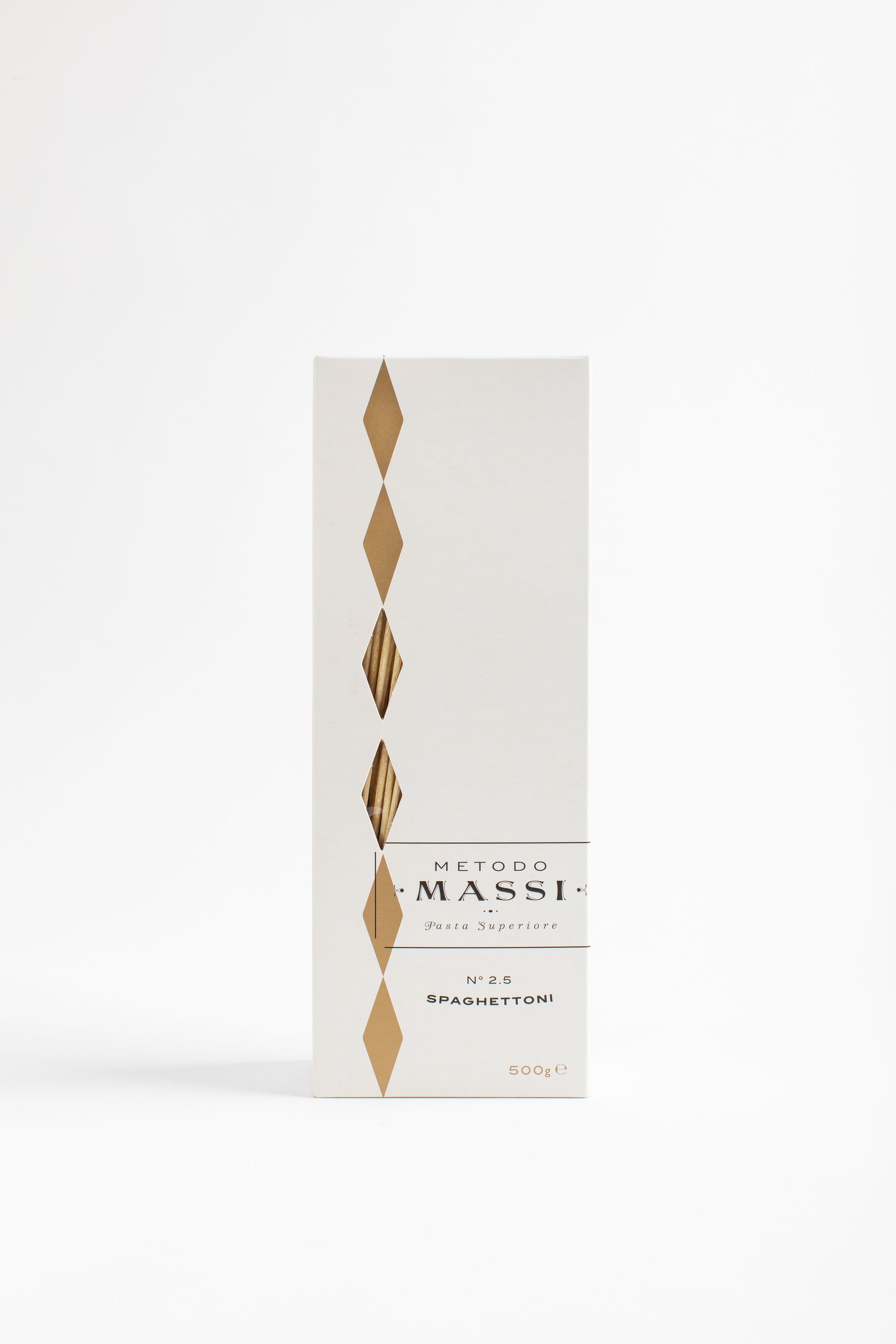 Wunderschön verpackt: Mit seinem eleganten Design sind Metodo Massi Spaghettoni N°2.5 eine beeindruckende Ergänzung für jede Speisekammer oder ein aufmerksames Geschenk für Feinschmecker.